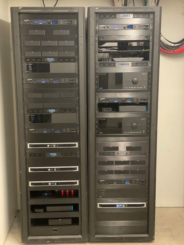 Luckily, our amps proved to be the perfect pairing for this robust auditory arrangement including Sonance Professional and James Loudspeakers.
