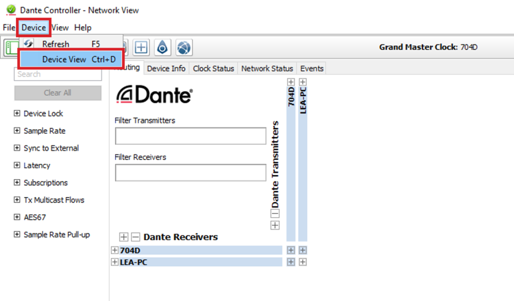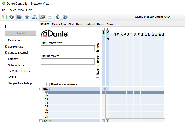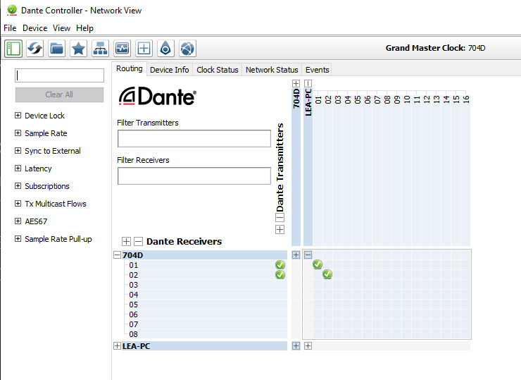 For the Dante Transmitter, enter the name of your computer. In this case, it is “LEA-PC”. For the name of the Reciever, enter the name of your amplifier. In this case, it’s “704D”.