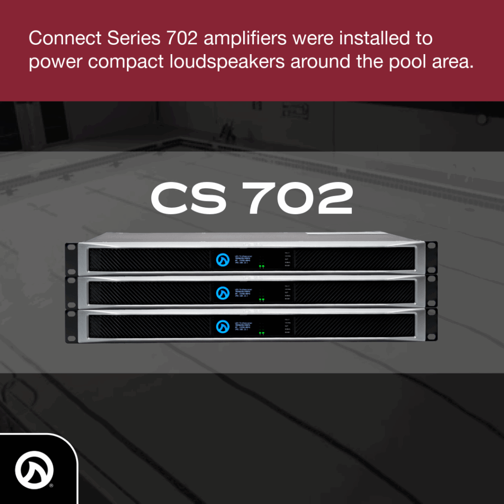 The new system includes an Allen & Heath AHM-16 16×16 audio matrix processor paired with Connect Series 702 amplifiers powering Danley GO2 8CX compact loudspeakers around the pool. The CS702 is a 2-channel amplifier with 700 watts per channel that supports Hi-Z (70V or 100V) and Lo-Z selectable by channel and features Smart Power Bridge technology.