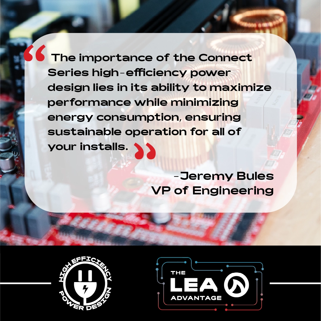 In conclusion, the advanced features of Connect Series amplifiers provide integrators with the flexibility to tailor systems to specific needs, whether it’s optimizing energy consumption, monitoring performance in real-time, or managing diverse speaker configurations. Smart power management is designed to meet the evolving demands of modern audio installations while setting a new benchmark for power, control, and efficiency—just one core aspect of what we like to call the LEA Advantage.