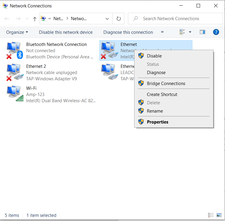 Right-click on “Ethernet” and click on “Properties” (Windows)