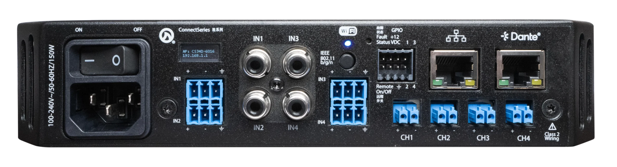 The Connect Series 34D delivers one of the most feature-rich amplifier experiences available in the industry—in a smaller form factor. Featuring 96kHz DSP, WebUI, SharkWare, LEA Cloud, third-party APIs, speaker tunings, and more—this amplifier is the right choice for your next install. The Connect Series Half-Rack is built with fully routable analog inputs, four amplifier channels with Lo-Z, 70V, or 100V selectable by channel and D-units include Dante and AES67 connectivity. All models boast three different ways of network connection: using the built-in Wi-Fi Access Point, connecting to an existing Wi-Fi network, or using a Local Area Network Ethernet connection.
