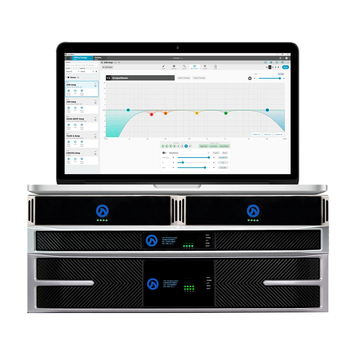 Developed with integrator and customer feedback, SharkWare offers both offline and online amplifier configuration for all Connect Series amplifiers. Available free for Windows and Mac, it includes features like amplifier grouping, offline design, user access controls, locked speaker tunings, and a graphical EQ.